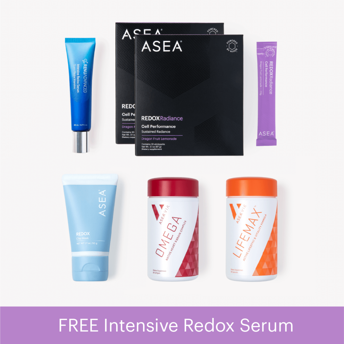 Experience the ultimate skin care trifecta with our beauty essentials bundle! Harness the power of redox signaling technology with a mask that purifies and a gel that revitalizes. Plus, love your skin from the inside out, with daily collagen support in REDOXRadiance. • One container of REDOXRadiance—a daily collagen support supplement that uses the same amino acid profile of collagen in your body to help promote radiant skin, full-volume hair, and stronger nails.* • Two tubes of ASEA® Redox Clay Mask—the only bentonite clay mask available that draws out impurities while also containing redox signaling technology, for better surface skin cell turnover. • One tube of RENU28® Revitalizing Redox Gel—which uses the full power of redox cell-signaling technology to renew, refresh, and re-invigorate your skin, right from the skin cell level. • One container of Cell Performance Variety Pack—this 3-in-1 variety pack gives you and your cells healthy and naturally flavored performance, with Powered by Redox™ ingredients!